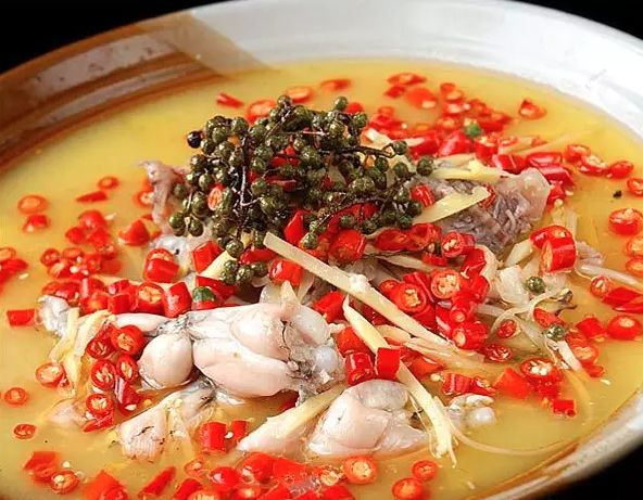 2.鍋里放化豬油和泡椒油燒熱,投入河鮮豆瓣、泡椒醬、泡椒節(jié)、干青花椒、泡蘿卜粒、泡青菜碎、蒜瓣和小米椒碎,炒香后摻鮮湯,在下入鯽魚燒制時(shí),加雞粉、味精、胡椒粉、醪糟汁、白糖和老陳醋調(diào)味,等收至鍋里汁將干時(shí),淋入藤椒油并出鍋裝盤,最后撒上藿香碎和蔥花即成。