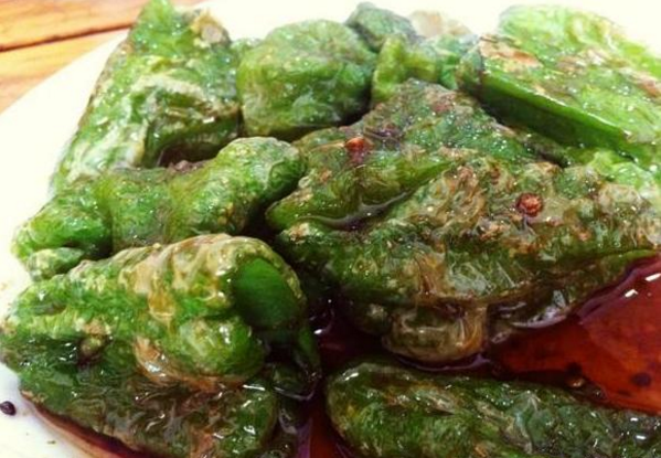 虎皮青椒,又叫虎皮海椒、糖醋辣椒癟子,是以青椒為主要材料制作的一道菜品,因青椒表面炒得略微焦糊,斑駁的焦糊點如同老虎的花紋而得名。只要將洗凈的青椒入鍋,干炒至表皮起皺。加入油后,翻炒至表皮膨脹皺紋劇增即可。原料便宜,做工簡單。成菜后,氣味清香,口感鮮辣,綿而不爛。有疾患者應少食或忌食。【最適合夏天吃的6道菜,尤其適合天熱吃,好吃到流眼淚!】